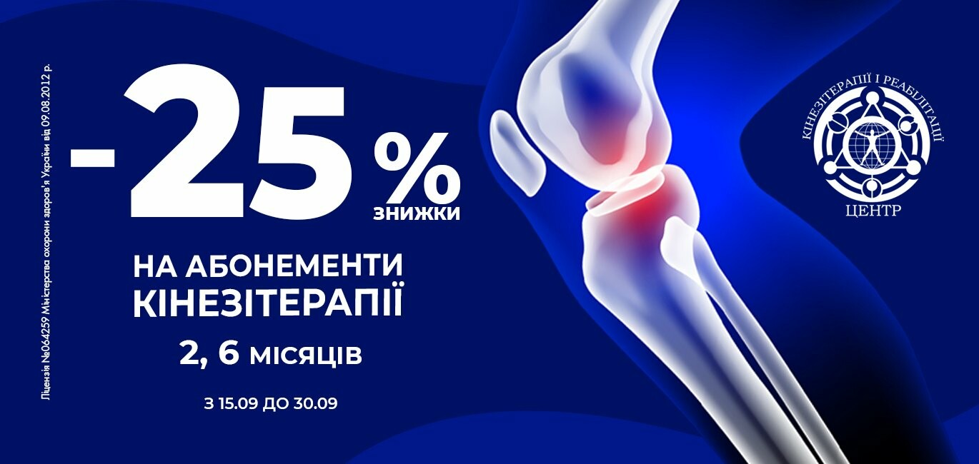 - 25 % знижка на абонементи 2, 6 місяців з кінезітерапії